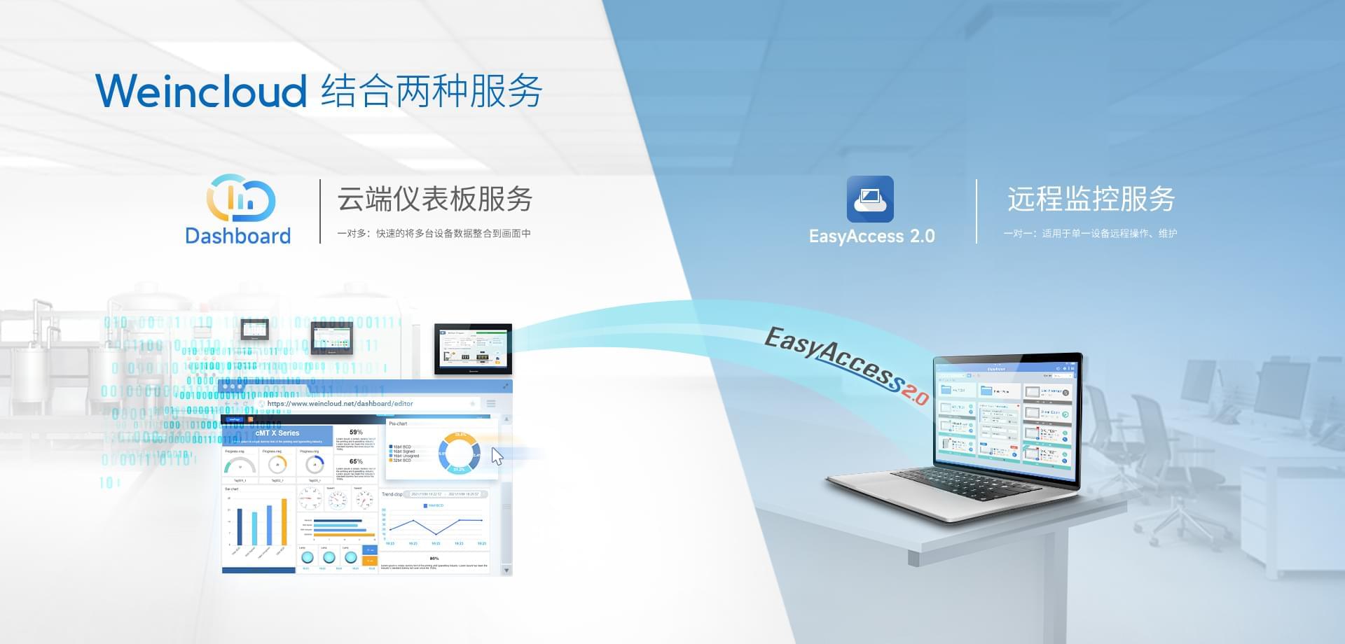 Weincloud 集結(jié)EasyAccess2.0遠(yuǎn)程監(jiān)控服務(wù)及Dashboard云端儀表服務(wù),將設(shè)備資料數(shù)據(jù)上云并以視覺化呈現(xiàn),協(xié)助管理者實(shí)時(shí)掌控現(xiàn)場產(chǎn)線狀態(tài)。
